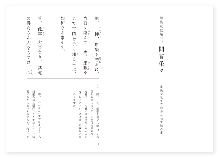 第一段は、演能の当日に於て、見所の空気を察知して、その日の能の吉凶を予知する事を中心として説かれてゐる。これは能の道に於て通達した上手が、第六感によつて知り得るものであつて、何人でも望み得られるものではないが、その大体を、親切に解剖的に、比較的初心者にもわかる程度に説明したのが此の一段である。しかも重要なことは、単に吉凶を察知するだけでなく、直ちにその情勢に対してとるべき処置が説かれてゐる点である。