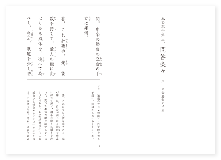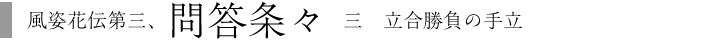 〔評〕 此の段の中心は、立合勝負に勝つ手段を説くのが眼目であり、「能数を持ちて敵人の能に変りたる風体を違へて為べし」、「敵方色めきたる能をすれば、しづやに模様かはりて、つめ所のある能をすべし。かやうに敵人の申楽にかへてすれば、如何に敵方の申楽善けれども、さのみに負くる事なし。若し能よくいでくれば、勝つ事は治定なるべし」といふ条が、その中心である。その手段として、能を作る事の必要が説かれ、最後に「曲柄の善悪が演出価値に及ぼす影響」について説かれてゐるのである。