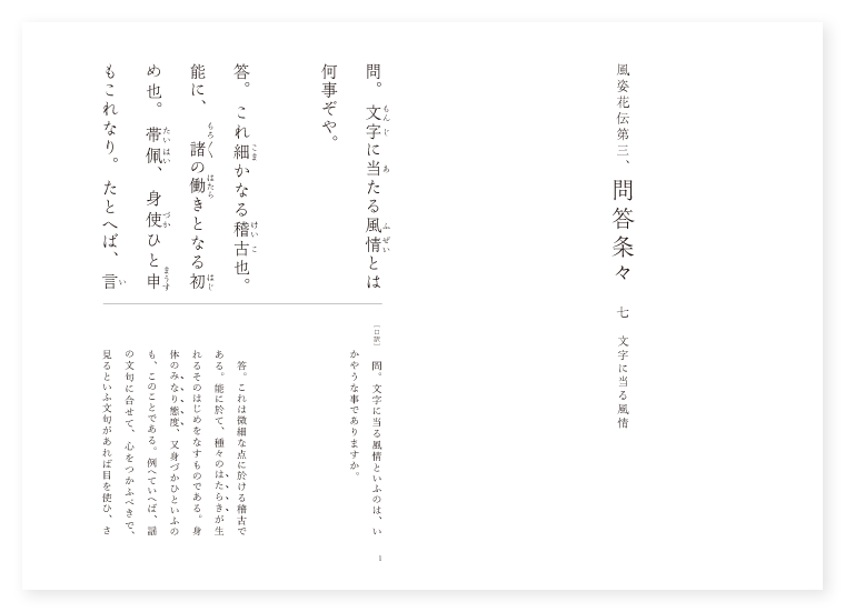 〔評〕 この段は、物真似の中の微細な物真似――女・老・軍体等の大きな姿風情の物真似に対して――即ち、謡の文句にあらはれた所の意味なり風趣なりを、その謡に合せて、為活かす物真似についてのべたものである。今日能の方で型又は形といはれて居る方面の芸について言つたものである。そして、これが所謂能を生かすか殺すかの分れ目となる大切な所である事は、能を見る人も、演ずる人も、十分に御承知のことと思ふ。これについての要件は「言ひごとの文字にまかせて、心を遣べし」といふ点を眼目とする。身体を動かし、手足を動かすのであるから、「言ひごとの文字にまかせて、身をつかふべし」と言つても良ささうに思はれるが、「心をつかふべし」といつた所を注意すべきであらう。身や手足のはたらきは末で、その根元は心にあるといふ事を明瞭に示して居る。物を聞くに、耳で聞く聞きかたと、心で聞く聞き方との間に、我々はその芸の生死の分れ目を感じはしないであらうか。心が自然に身体の動きににじみ出るのと、心がお留守で身体だけが動くのとは、大分と感じがちがふやうである。かやうに考へる私は、宗節本の本文より、吉田本の本文の方が、深味があるやうに思ふ。かく心をつかふことが、「おのづからに、振にも風情にもなるなり」といふのは、味はふべき所であらう。
