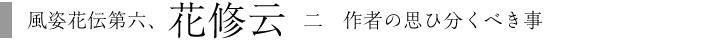 それは、「一切の事は、いわれを道にしてこそ、よろづの風情にはなるべき理なれ」といふのが眼目である。「謂れ」を現はすものは、謡の文句である。その文句を聞かせるのが音曲である。音曲的に美しく謂れが語られ謡はれる時、見物人はその曲の心を知るのである。その心が知れなければ、動作の示す心もわからない。従つて、音曲が能の本体をなすもので、それから動作が生れ出るのだから、「音曲は体也、風情は用なり」といふべきである。体あつての用であるから、音曲から風情はたらきが生ずるのは順であり、風情働きで以て音曲をするといふのは逆である。後の花鏡に「先づ聞かせて、次に見せよ」といふ注意がのべられてゐるが、これはこの順逆の道理を明かにしたものである。それで、演ずる者の心得としては、「謡ふ文句の意味や風趣で以て、風体や伎に風情あらしめるやうにする」といふことが第一の要件となるのである。演者の立場としては、「音曲より風情が生ずる演じ方」が眼目である。しかし、能の作者としては、そのやうな演じ方が出来るやうな能を作ることが眼目である。作者としては、文句を綴り謡曲を書くには、舞台上のシテの動作・はたらき・わざを本として、さうしたはたらきが生れるやうに文句を綴るべきであるといふのである。舞台上のはたらきを考へない曲なら、それはただ謡ひものとしてのみの価値しかなく、全く能の詞章としての価値は無い。舞台上に於て、シテの面白い働きが生れるやうに綴られた文章を謡ふならば、その音曲から自然に働きは生れて来るわけである。で、作書者としては、「風情を先立てて、しかも謡のふしかかりの面白いやうにと研究すべきである」といはなければならないのである。
