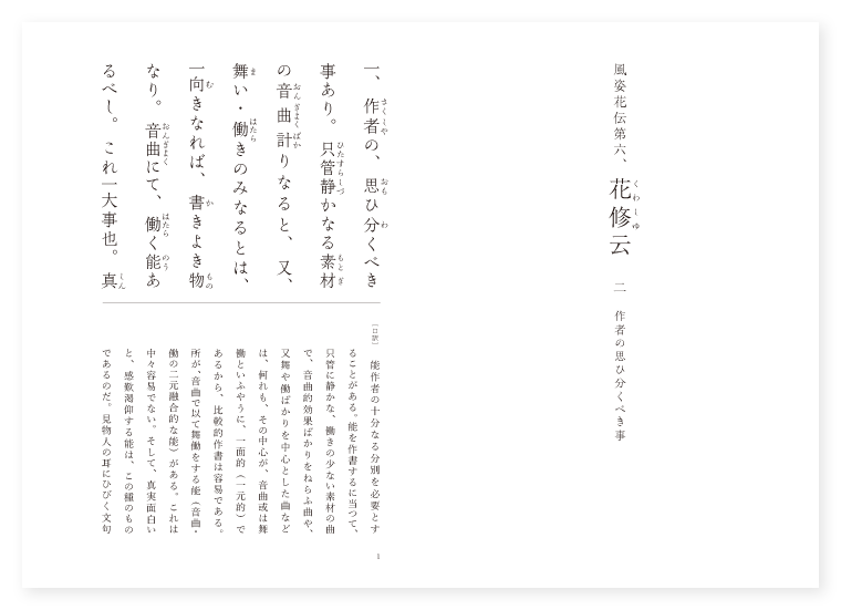 この考へ方は、実に巧妙である。舞台を知らぬ作者の作つた脚本は、結局レーゼドラマに終るといふのは、此頃もやかましく言はれる処である。舞台に精通し、役者の伎や個性に合ふ脚本でなくては、成功しない。その点で、世阿弥のやうに、自分が役者と作者を兼ねた者は鬼に金棒の強さがある。