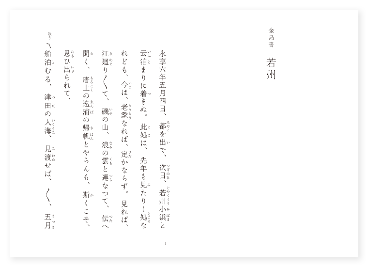 永享六年五月四日、都を出で、次日、若州小浜と云泊まりに着きぬ。此処は、先年も見たりし処なれども、今は、老耄なれば、定かならず。見れば、江廻り〳〵て、磯の山、浪の雲と連なつて、伝へ聞く、唐土の遠浦の帰帆とやらんも、斯くこそ、思ひ出られて、 歌う〽 船泊むる、津田の入海、見渡せば、〳〵、五月も早く、橘の、昔こそ、身の若狭路と見えしものを、今は老の後背山、され共、松は緑にて、木深き梢は、気色立つ、青葉の山の夏陰の、海の匂ひに映ろひて、差すや潮も、青浪の、さも底ひ無き、水際哉、〳〵。青苔衣帯びて、巌の肩に懸かり、白雲帯に似て、山の腰を囲ると、白楽天が詠めける、東の船、西の舫、出で入る月に、影深き、潯陽の江の頭、斯くやと、思ひ知られたり。
