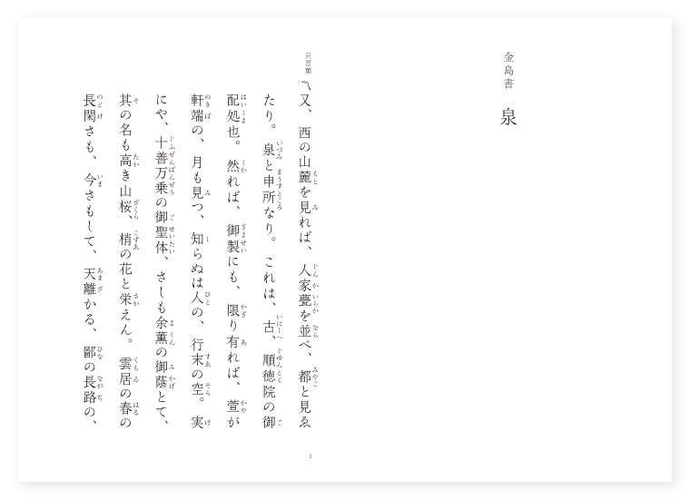 〔口訳〕又、西方の山麓を見やると、人家が甍を並べてたち列なつて、この国の都と思はれる眺めである。泉と申す所である。これは往昔、順徳院の御配処であつた所である。それで御製にも、「限りあれば萱が軒端の月も見つ、知らぬは人の行末のそら」と御詠み遊ばされたのである。まことに、十善万乗の御聖体を迎へ申して、さしも有難い余薫の御蔭を蒙つたといふので、世に名高い此処の山桜は、梢の花に益々其の栄えを見せることであらう。雲居の春の長閑さを思ふにつけ、今かやうにして、遠境辺土の御住居を拝しては、御心の程も拝察せられて、まことに御痛はしいことである。所は萱草が生ひしげり、草葺の軒端には忍草の簾も、絶えだえの有様である。夕立が降り落ちて、庭には庭潦が流れる。これも泉といふべきであらうよ。「下くぐる水に秋こそ通ふらし、掬ぶ泉の手さへ涼しき」といふ古歌があるが、泉を掬び給ふ御手の涼しい折々には、御衣の袂は御涙にぬれ萎れた事であらう。ほんに思へば、「人ならぬ岩木もさらに悲しきは、美み豆づの小島の秋のゆふぐれ」と遊ばされた御製も、遂に御身の上の悲しさとなつてしまつたことである。「樒摘む山路の露にぬれにけり、暁起きの墨染の袖」といふ歌があるが、その墨染の世捨人同様の苔筵、これが錦の御褥であつたらうなどとは、誰が思ひかけようか。誠に御痛はしい限りである。「薪こる遠山人は帰るなり、里まで送れ秋の三日月」と御詠み遊ばした秋の三日月も、雲の端に物憂げな光を放つてゐる。この浮世の儚さは、万乗の大君とても御のがれになることは出来ないことであつた。それで「言ふならく奈落の底に入りぬれば、刹利も首陀もかはらざりけり」と言はれてゐるのである。まことに、この泉の水も、大君が御住み遊ばせば、「蓮葉の濁りにしまぬ」とよまれた清らかさで、涼しい浄土となることであらう。