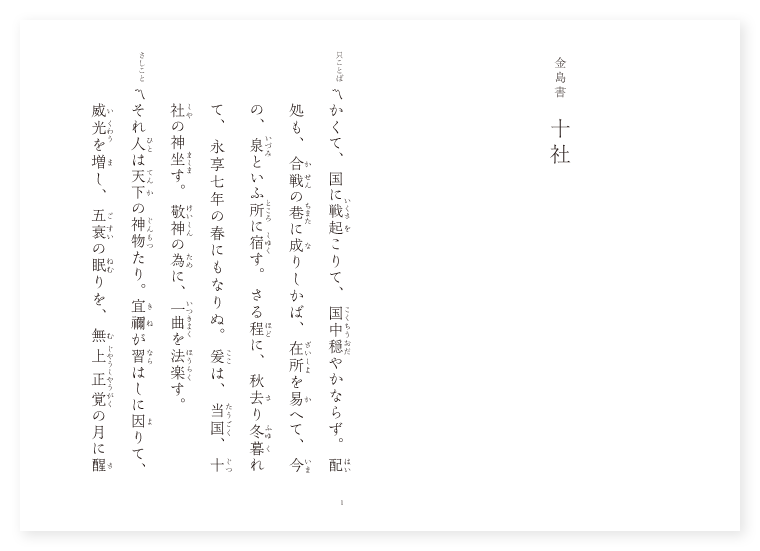 〔口訳〕かくて居る中に、国に戦が始まつて、佐渡一国はさわがしくなり、自分の配処の新保も合戦の巷となつたので、住所をかへて、今いつた泉といふ所に宿する事となつた。その中に秋も過ぎ冬も暮れて、永享七年の春にもなつた。此の地には当国の十社の神がまします。敬神の為に一曲を法楽し奉つた。 一体、一人間といふものは、天が下の神様のものである。神といふものは、お仕へする神官の鄭重な奉仕によつて威光を増し給ふものであり、神の五衰の睡りは、仏法の無上正覚の悟りによつてさまされるものであり、衆生等も息災延命であるやうにと、御守護下さる御誓願は、まことに有難い御めぐみと申すべきである。神の導き給ふままに御参りをし、御宮廻りの歩みを運ぶことである。まことに和光同塵は結縁の御初めであり、八相成道は利物の終であるのだらう。大倭秋津島の国の中は、聖代の御恵みや神の御恵みによつて、国土は豊かで、民は豊年を楽しむといふ御代であるので、九旬の春は久しく、十の社の御威光は曇りもないことである。