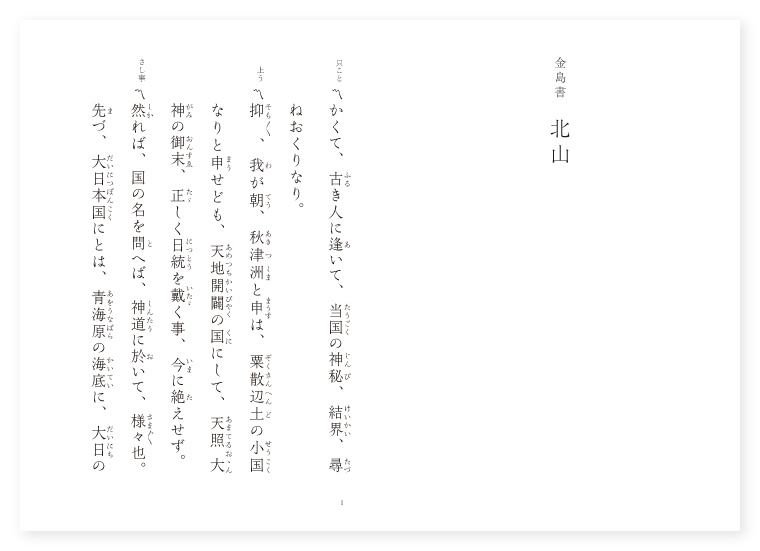 〔口訳〕かくの如くして、此土地の古老に会つて、当国佐渡の神秘結界を尋ねて記して置くのである。 一体、我が朝秋津洲と申す国は、粟散辺土の小国だとは申すけれども、天地開闢の国であつて、天照大神の御神裔が、正しく日統を御継ぎ遊ばされる事は、今も絶える事のない国である。それで、この国の名称を尋ねて見ると、神道に於て様々の名が呼ばれてゐる。先づ、大日本国といふは、青海原の海底に、大日といふ黄金の文字が現はれ給うたことから、後代になつて、かやうな国名を附けたとかいふことである。暫くこれを考へて見るに、そのしなじなも数多いことであるから、あれこれに関して、大略のところを語ることにしよう。 この国の初を考へて見ると、天祖の御譲りであつて、天の浮橋の上から、差し下し給ふ瓊矛の滴りに成つた淡路の国をはじめとして、それは南海に、この佐渡の島は北海にあつて、胎蔵・金剛の両部を具へて、南北の海上に浮んでゐるのである。そして海上の四方の涯までを守り、七葉の黄金の蓮の上から浮み出てゐる国として、此の両島を、神の父母とも呼ぶとかいふ事である。それで北野天満宮の御歌にも、「かの海に黄こ金がねの島のあるなるを、その名ととヘば佐渡といふなり」とよまれて居り、この御神詠もあらたかで、其の妙なる国の名は久しく知られてゐる所である。さて、その神代の伊奘諾・伊奘冊の二柱の神は、今は別々に御垂跡遊ばされて、伊奘諾は熊野の権現とあらはれ、南山の雲に種を蒔いて国家を治められ、伊奘冊は白山権現とあらはれ給うて、北海に種を収められながら、菩提涅槃の月影として、此の佐渡の国即ち北山に、毎月毎日御影向になり、今に絶える事がないので、国土は豊かで民も敦厚であり、雪の白山も伊奘冊も、共にこの佐渡の海におさまり給ふとかいふことである。一体かやうなあらたかな国に、仮初ながら我が身を置く事も、どうした他生の縁によつたものであらうか。ああ善き哉、自分如き雲水の身も、住むにまかせて住ましめておき、そのままで衆生諸仏も相犯すこともなく、山は自づからにして高く、海は自づからにして深くたたへてゐる。「語り尽す山雲海月の心」といふ言葉の如く、まことに面白いのは佐渡の海で、満目青山また自づからなるよそほひを示す。その名を問へば佐渡といふ、この黄金の島は妙なる所である。