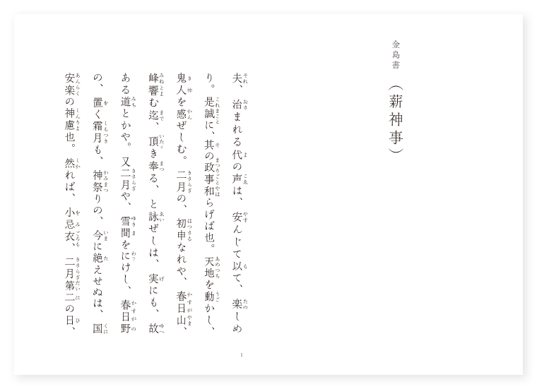 〔口訳〕一体に、世の中がよく治まつて居る聖代の歌謡は、民心が安らかで且つ楽しんでゐる心があらはれるものである。これ実に、其の政事が穏和に行はれて居ることに依るのである。従つて歌は、天地を動かし鬼神を感ぜしめるものだと言はれるのである。「きさらぎの