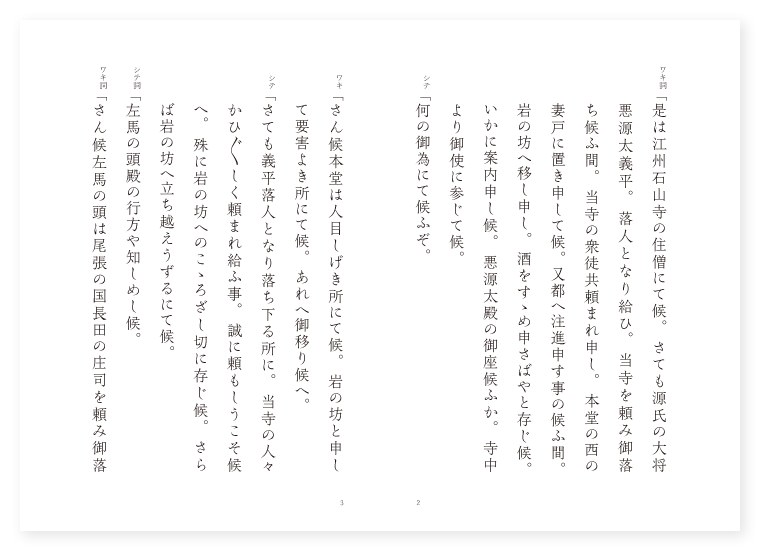 ワキ 石山寺の住僧 シテ 悪源太義平 ツレ 難波次郎 地は 近江 季は 雑 ワキ詞「是は江州石山寺の住僧にて候。さても源氏の大将悪源太義平。落人となり給ひ。当寺を頼み御落ち候ふ間。当寺の衆徒共頼まれ申し。本堂の西の妻戸に置き申して候。又都へ注進申す事の候ふ間。岩の坊へ移し申し。酒をすゝめ申さばやと存じ候。いかに案内申し候。悪源太殿の御座候ふか。寺中より御使に参じて候。 シテ「何の御為にて候ふぞ。 ワキ「さん候本堂は人目しげき所にて候。岩の坊と申して要害よき所にて候。あれへ御移り候へ。 シテ「さても義平落人となり落ち下る所に。当寺の人々かひ〴〵しく頼まれ給ふ事。誠に頼もしうこそ候へ。殊に岩の坊へのこゝろざし切に存じ候。さらば岩の坊へ立ち越えうずるにて候。 シテ詞「左馬の頭殿の行方や知しめし候。 ワキ詞「さん候左馬の頭は尾張の国長田の庄司を頼み御落ち候ふところに。長田の庄司かひ〴〵しく頼まれ申し。日番きびしく守護し申し候ふとこそ承りて候へ。 シテ「長田は譜代の郎等なれば。よも心がはりは候ふまじ。さて頼朝は何とかなりて候ふらん。 ワキ「それは何方の御志とは知らず。当国へ御下り候ひて草野の辺に御座候ひしを。平家の侍弥平兵衛三百余騎にて都へ御供申したると承り及びて候。 シテ「さては早切られてぞ候ふらん。末の露本の雫や世の中の。今日ありとてもあだ命。明日をもいさや白真弓。石山寺の苔とや朽ちん。定めなの世の中や。 ワキ詞「しばらく候。源氏の当寺より御出であつて。出世し給ひし嘉例の候。 シテ「それこそ聞かまほしう候へ。とく〳〵御物語り候へ。 ワキ詞「さても康保元年八月十五日に。紫式部当寺に籠り源氏の物語を書く。されども大慈大悲の御ちかひにや。程なく源氏六十帖を書き大やけに奉る。君此草子を叡覧あつて。諸国に弘め給ひしよりこのかた。源氏の物語とて天下に名を得たる草子なり。また此君も源氏の嫡子にてましませば。当寺より御出であつて。必ず御代をめさるべき。御瑞相とこそ存じ候へ。 シテ「それは物語の源氏。是は武勇の手本。たとへにならぬ事なれども。名詮自称と申す事の候ふ程に。時の祝言候ふな。 ワキ「中々の事必ず御代をめされうずるにて候。 シテ「実にや縁もなつかしき。紫式部が筆の跡。 ワキ「出でし源氏も此寺の。大慈大悲の値遇の縁。 シテ「薩埵の悲願さま〴〵なれども。多き中にも救世の願。 ワキ「有縁は殊に申すに及ばず。 シテ「縁なき人をも洩らさじの。 ワキ「ちかひぞ深き。 シテ「鳰の海。 地「さゝ浪さゆる志賀の浦。〳〵。洲崎に立てる一つ松の。影すごく見えたるは。今の義平が。たぐひなき身に知られたり。比良の山。おろしや寒き比叡の大嶽。雪のふゞきのさえかへり。志賀の山越園城寺。関山粟津見え渡る。瀬田の長橋。とだえなく多き名所かな。 ワキ詞「いかに申すべき事の候。悪源太殿の十六騎の兵。御大将共に十七騎の御名字が承りたく候。 シテ詞「安き間の事語つて聞かせ申すべし。昔は源平左右にして。朝家を守護し奉るといへども。保元の代の乱れ。親子兄弟おし分つて。敵となり味方となる。こゝに悪右衛門の督信頼といふいたづら者に与し。平治に謀叛を起しゝかば。源平両家の合戦となる。 地「去んぬる保元に。〳〵。味方と有りし清盛も。平治の今は敵となつて。合戦数度に及びたり。平家は三千余騎。味方はわづか五百余騎。されども軍には。一度不覚の名を取らず。 クセ「平家の大将重盛が。手勢五百余騎。信頼が固めたる。郁芳門にさし向ふ。陽明門は纔に。義平が手勢十六騎。たとへば蟷螂が斧を執つて。龍車に向ふ如くなり。十六騎の兵は。鎌田兵衛政清。後藤兵衛実元。波多の次郎義通。佐々木の源三三浦の次郎。山の内の。須藤刑部成道。岡部の六弥太忠澄。長井の斎藤別当実盛。猪の俣の小平六のりつな。熊谷の次郎直実。金子の十郎。平山の武者季重。足立の右馬の允。上総の介広綱。関の次郎伊切の八郎。是等は一人当千の兵。悪源太我十七騎是なり。 ワキ詞「近頃承る事にて候。とてもの御事に候はゞ。二条堀川材木の合戦の有様。まなうで御見せ候へ。 シテ「さても義平は陽明門を固めたりしに。達智門におはします。義朝の方より使者を立て。悪源太一合戦仕れとありしかば。畏つて候ふとて。例の十七騎。敵五百余騎が中に割つて入り。散々に切つてまはる。敵五百余騎は味方十七騎に切り立てられ。大庭の椋の木のもとまで追つ散らさる。其時鎌田申すやう。重盛の召されたる御鎧は。唐革と申して。射るとも切るとも裏かく事あるまじ。唯御馬をあそばし候へ。跳ね落さんとする処を寄つて組ませ我君と申す。実にもと思ひ十三束の中ざしよつぴいて放つ。何かは少しはづすべき。馬の三つよりむながひ掛けずつゝと射通す。名馬なれどもこらへずして。頻りに跳ぬれば重盛は。二条堀川材木の上におり立つて。小烏ぬいて待つ処を。 地「政清是を見て。馬より飛び下り太刀さしか