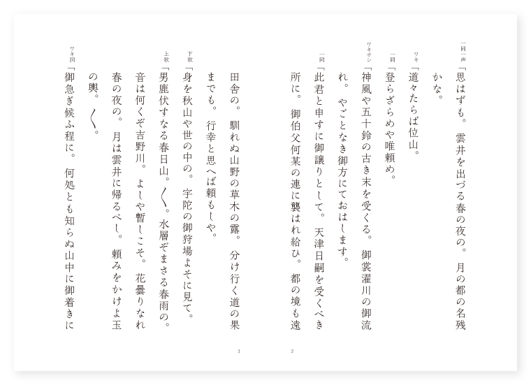 世阿弥作 前 子方 帝 ワキ 供奉の官人 立衆 随行一同 シテ 漁翁 ツレ 老女 狂言 追手の兵 後 シテ 蔵王権現 地は 大和 季は 春 一同一声「思はずも。雲井を出づる春の夜の。月の都の名残かな。 ワキ「道々たらば位山。 一同「登らざらめや唯頼め。 ワキサシ「神風や五十鈴の古き末を受くる。御裳濯川の御流れ。やごとなき御方にておはします。 一同「此君と申すに御譲りとして。天津日嗣を受くべき所に。御伯父何某の連に襲はれ給ひ。都の境も遠田舎の。馴れぬ山野の草木の露。分け行く道の果までも。行幸と思へば頼もしや。 下歌「身を秋山や世の中の。宇陀の御狩場よそに見て。 上歌「男鹿伏すなる春日山。〳〵。水層ぞまさる春雨の。音は何くぞ吉野川。よしや暫しこそ。花曇りなれ春の夜の。月は雲井に帰るべし。頼みをかけよ玉の輿。〳〵。 ワキ詞「御急ぎ候ふ程に。何処とも知らぬ山中に御着きにて候。先此所に御座をなされうずるにて候。 シテ詞「姥や見給へ。 ツレ詞「何事にて候ふぞ。 シテ「あの祖父が伏屋の上に。紫雲の棚引いたるを拝まい給うたか。 ツレ「実に〳〵あたりに紫雲棚引き。たゞならぬ空の気色やな。 シテ「あふ唯ならぬ気色候ふよ。昔より天子の御座所にこそ。紫雲は立つと申せ。もしも不思議に尉が住家に。 ツレ「左様の貴人やおはすらんと。 シテ「舟さし寄せて我屋に帰り。 ツレ「見れば不思議やさればこそ。 シテ「玉の冠直衣の袖。 ツレ「露霜にしをれ給へども。 シテ「さすがまぎれぬ御粧ひ。 地「さもやごとなき御方とは。疑ひもなく白糸の。釣竿をさし置きて。そもや如何なる御事ぞ。かほど賤しき柴の戸の。暫しが程の御座にも。なりける事よいかにせん。あら忝なの御事や。〳〵。 シテ詞「是はそも何と申したる御事にて候ふぞ。 ワキ詞「是はよしある御方にて御座候ふが。間近き人に襲はれ給ひ。是まで御忍びにて候。何事も尉を頼み思し召さるゝとの御事にて候。 シテ「さてはよしある御方にて御座候ふか。幸ひ是は此尉が菴にて候ふ程に。御心安く御休みあらうずるにて候。 ワキ「いかに尉。面目もなき申し事にて候へども。此君二三日が程供御を近づけ給はず候。何にても供御にそなへ候へ。 シテ「其由姥に申さうずるにて候。如何に姥聞いて有るか。此二三日が程供御を近づけ給はず候ふとの御事なり。何にても供御に奉り給へ。 ツレ「折節是に摘みたる根芹の候。 シテ「それこそ日本一の事。我等もこれに国栖魚の候。是を供御に備へ申さうずるにて候。 ツレ「姥は余りの忝なさに。胸うちさわぎ摘み置ける。根芹洗ひて老が身も。心若菜をそろへつゝ。供御にそなへ奉る。それよりしてぞ三吉野の。菜摘の川と申すなり。 シテ「祖父も色濃き紅葉を林間に焚き。国栖川にて釣りたる鮎を焼き。同じく供御にそなへけり。 地「吉野の国栖といふ事も。此時よりの事とかや。蓴菜の羹鱸魚とても。是にはいかで勝るべき。間近く参れ老人よ。〳〵。 ワキ詞「いかに尉。供御の御残りを尉に賜はれとの御事にて候。 シテ詞「あら有難や候。さらば打ち返して賜はらうずるにて候。 ワキ「そも打ち返して賜はらうずるとは。何と申したる事にて有るぞ。 シテ「打ち返して賜はらうずると申すこそ。国栖魚のしるしにて候へ。いかに姥。供御の残りを尉に賜はれとの御事にて候ふが。此魚はいまだ生々と見えて候。 ツレ「実に此魚はいまだ生々と見えて候。 シテ「いざ此吉野川に放いて見う。 ツレ「筋なき事な宣ひそ。放いたればとて生きかへるべきかは。 シテ「いやいや昔もさるためしあり。神功皇后新羅を従へ給ひし占方に。玉島川の鮎を釣らせ給ふ。其如く此君も。二度都に還幸ならば。此魚もなどか生きざらんと。 地「岩切る水に放せば。〳〵。さしも早瀬の滝川に。あれ三吉野や吉瑞を。顕はす魚のおのづから。生きかへる此占方。頼もしく思し召されよ。 ワキ詞「いかに尉。追手がかゝりて候。 シテ詞「此方へ御任せ候へ。いかに姥。あの舟かいて来う。 ツレ「心得申し候。 狂言「シカ〳〵。 シテ「何清み祓へ。清み祓へならば此川下へ行け。 狂言「シカ〳〵。 シテ「さては清見原とは人の名よな。あら聞きなれずの人の名や。其上此山は。都卒の内院にもたとへ。又五台山青龍山とて。唐までも遠く続ける吉野山。隠家多き所なるを。何くまで尋ね給ふべき。速かに帰り給へ。 狂言「シカ〳〵。 シテ「何と舟が怪しいとや。是は乾す舟ぞとよ。 狂言「シカ〳〵。 シテ「何と舟を捜さうとや。猟師の身にては舟を捜されたるも家を捜されたるも同じ事ぞかし。身こそ賤しく思ふとも。此所にては翁もにつくき者ぞかし。孫も有り曽孫もあり。山々谷々の者ども出で合ひて。あの狼藉人を打ち留め候へ打ち留め候へ。 狂言「シカ〳〵。 ツレ「なふ聞し召せ追手の武士は帰りたり。 シテ「今はかうよと祖父姥は。 ツレ「うれしや力を。 シテ「えいや。 二人「えいと。 地「舟引き起し尊体の。〳〵。御恙なく川舟の。かひある御命。たす