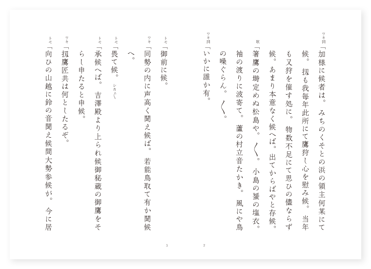 シテ 猟師 ワキ 卒都浜領主 トモ 従者 所 陸奥卒都浜 ワキ詞「加様に候者は。みちのくそとの浜の領主何某にて候。扨も我毎年此所にて鷹狩し心を慰み候。当年も又狩を催す処に。物数不足にて思ひの儘ならず候。あまり本意なく候へば。出てからばやと存候。 歌「箸鷹の塒定めぬ松島や。〳〵。小島の蜑の塩衣。袖の渡りに波寄て。蘆の村立音たかき。風にや鳥の噪ぐらん。〳〵。 ワキ詞「いかに誰か有。 トモ「御前に候。 ワキ「同勢の内に声高く聞え候ば。若能鳥取て有か聞候へ。 トモ「畏て候。(シカ〴〵) トモ「承候へば。吉澤殿より上られ候御秘蔵の御鷹をそらし申たると申候。 ワキ「扨鷹匠共は何としたるぞ。 トモ「向ひの山越に鈴の音聞え候間大勢参候が。今に居上候共申来らず候。 ワキ「言語道断。いつに替り当年は。鷹狩思ひの儘ならず候に。今日は又秘蔵の鷹を失ひ。何とすべき共わきまへず候。かく長居してせんなし。はや帰らふずるにて有ぞ。鷹の事をば随分申付候へ。 トモ「畏て候。御立腹御尤にて候。今日は御慰御座なく候間。此山陰を向へ御越なされ。沢伝ひに御帰。景をも御覧有て然べう候。 ワキ「さらば向へ渡らふずるにて候。 シテ、一声「面白やそとの浜成呼子鳥。声にやさそふ心哉。 サシ「浅ましやなす事なくて徒に。殺生を経営。頭には霜を戴き。四海の波身に打よれども。さらに後世を弁ず。何方の山此方の沢に。邪見の杖に簑笠。科なき鳥を追立〳〵。流し網さし縄に。懸れる鳥の数々も。来世の責の恐ろしさよ。遁るまじきは報ひかな。 詞「よしなき事を思ひて候。鳥をおゝふずるにて候。又是へ人の余多見えて候。喃喃旁々は何方へ御通り候ぞ。 ワキ「是は年々向ひの山を鷹狩する者なり。けふは秘蔵の鷹を失ひ。心よからず帰る者也。扨汝は如何成ものぞ。 シテ「是は此そとの浜の猟師にて候が。若年より殺生を好み。鳥取世を渡る者にて候。 ワキ「扨は幸成事なり。汝が殺生の手立を見せ候へ。 シテ「さらば鳥取つて御目にかけ候べし。去ながら。 カヽル「頭に雪の積るまで。かゝるしわざは愧しや。 ワキ「あら愚や老とても。今の楽しみ有なれば。来世も何か苦しみあらん。 シテ「さて出立し我が姿。簑は解脱の衣にて。 ワキ「柱杖を表す竹の杖。 シテ「笠は八葉蓮花なれば。 ワキ「濁りにしまぬ。 シテ「水鳥を。 同「追廻し〳〵て。隙なく鳥を取時は。罪も酬ひも後の世も。忘れ果て面白や。老のおもひ出成らん。未来はとにもかくにも。 クセ「先春は長閑にて。鳴音妙成鶯の。声に雪消し跡にやそだつ村鳥。夏の空は一入唯声ゆかし時鳥。心有人々の。うちぞ床敷そとの浜。外面の雨濡々し。早乙女の帰るさに。笘やたゝくはくひなか。 シテ「秋は元来雁金の。 同「雲井に渡れる空もあり。又水に宿るは。おしかもめさぎすら。鴫立沢は余所にだに。ありとは聞ど所がら。名取の川やなこその関。冬川に成までも。千鳥やよるらん。いざいざ取りて参らせん。 ワキ詞「近比面白き者に参逢て候もの哉。急いで鳥を取候へ。 シテ、カヽル「あれ〳〵御覧候へや。おもはぬかたに集る鳥の。跡をしたひて能みれば。 同「はかなや此鳥の。〳〵。木々の梢に波の浮すかけ。又は平砂に子を生かくせる。あかたの鳥の。うとふと呼れて答ふるぞや。 シテ「うとふ。(カケリ) 同「簑笠杖を押取持て。〳〵。爰やかしこの草村深山。木々の梢に巣をくふ鳥ならば。げに松島に多かるらん。 シテ「是々み給へ人々よ。 同「是々み給へ人々よ。老の振舞はづかしながら。稀人に慰みの殺生の有様。是までなれや。御暇申と立帰れば。狩人名残を惜み給ひ。見送り帰らせ給ひければ。 シテ「我は其時去にても。〳〵。 同「今日の殺生面白や。身にも応ぜぬ老のわざながら。若年の比よりかく殺生の罪は怖しや。然りとはいへども。一日の栄花ぞ老のおもひ出。けふの狩場を今陸奥の。けふの細布胸逢がたき。簑笠着てこそ帰りけれ。 底本:国立国会図書館デジタルコレクション『古今謡曲解題』丸岡桂 著、『宴曲十七帖 謡曲末百番』国書刊行会 編