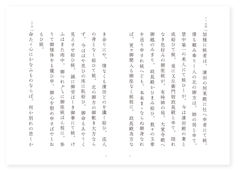 シテ 濱田の妻(帥の局) ツレ 濱田の侍女侍従 ワキ 濱田某 ツレ、女詞「加様に候者は。濱田の何某殿に仕へ申者にて候。偖も頼み奉りし人の北の御方は。帥の局と申て。禁中第一の美人にて候ひしが。今は濱田殿の妻と成給ひて候。爰に又左衛門尉政長殿と申て。隠れなき色好みの御座候が。有時帥の局。大覚寺殿へ御越のみぎり。政長殿かひまみ給ひ。数々の玉章を送り申され候へども。本来まゝならぬ御身なれば。更々御聞入も御座なく候程に。政長殿為方なき余りにや。情なくも濱田どのを讒し給ひ。流人の身となし給ひて候。北の御方の御歎き大方ならず。今ははや思ひの床に臥給ひ。御命もあやうく見えさせ給ひ候。誠に御労はしき御事にて候。けふはまた雨中。御つれ〴〵に御座候はん程に。参りて御様体をも窺ひ申。御心を慰め申さばやとおもひ候。 シテ女「命たゞ心にかなふものならば。何か別れの悲しかるらん。数々に。思ひおもはず。とひ難み。身をしるあめは。ふりぞ増れる。 ツレ女「いかに申上候。侍従が参りて候。 シテ「侍従と申歟。此方へ来り候へ。 ツレ女「けふは物さびしき雨の中。御心地は何と御入候ぞ。 シテ「さなきだにいとゞくるしき枕の上に。窓うつあめの音高く。 カヽル「夢もむすばぬ思ひねの。難面命のおしかるも。あかで別れし我妻に。またもあふせの憑みかな。 ツレ女「実々御歎き尤にて候。さりながら。御心やすくおぼしめされ候へ。殿は御身に御誤りなき通りを。君聞召及ばせ給ひ。頓て御帰京有べきとの御事也。唯御心をとりなをさせ給ひ。御薬をも用ひ給はゞ。すゑは目出たふ御対面にて候べし。 シテ「嬉しき人の言葉かな。科なき妻の左遷のつみも。たゞ我ゆへとおもへば猶も。 カヽル「五の障りをもきがうへの。身の後の世もをしはかられて。やるかたもなき小車の。廻りあひなば憂事も。晴て行なん心の月の。曇らぬ御影憑むなり。 同「実やたのむの雁金も。花を見すてゝ行空の。雲井遥かにたちへだつ。妻の音信もなき世の中ぞ悲しき。 歌、同「こぬ人をまつほの浦の夕なぎに。〳〵。焼やもしほのこがれゆく。身はうきふねの。よるべも涙の袖ぞいとなき。よしやしばし社。岩にせかるゝ滝川の。破れてもすゑの逢瀬の。たのみをかけて。木綿四手の。神の恵みの明らかに照させ給へ。我こゝろ〳〵。(中入) 次第「替る浮世もかはらざる。〳〵。妹背の川ぞ頼もしき。 ワキ詞「是は濱田の何某にて候。扨も我よしなき人の讒奏により。遠流の身と成て候へども。我身に誤りなきむねを君聞召分られ。此度御免を蒙り本領安堵し。唯今都へ上り候。急候程に。是ははや都に着て候。是成館が某が家にて有げに候。浅ましや我流人の身となれば。住こし宿もあれ果て。庭も籬もよもぎふの。昔語りもおもひ出られ。目もあてられぬ有様にて候。 サシ「実や風碧瓦を飄へして雨垣を摧き。池は水草に埋れて。蛙あらそひ梟も。所得貌に嘯きて。誠に気疎分野かな。 詞「いかに誰かある。濱田こそ此度御免を蒙りて罷帰りたるぞ。此よし申候へ。 ツレ女「や。是は目出度御事にて候。いそひで此由北の御方へ申さふずるにて候。いかに申上候。殿の御帰りにて候。急ひで御対面候へ。 シテ「何。殿の御帰りと申か。あらうれしや焉くに御渡り候ぞ。 ワキ「なふ某こそ帰りて候へ。何とてかやうに御やつれ候ぞ。 シテ「実や何事も。隔てぬ中といひながら。かく浅ましくおとろえし。姿ま見ゆる愧かしさよ。さりながら。君を思ひの涙の面に。花の袂は朽ぬとも。情の色はうつろはぬ。心の内を思ひ知れ。 ワキ詞「勝々うれしき仰かな。我も年月思ひの外に。つらき配所の身と成しも。花の袂に置露の。むすぶ契りの色かへぬ。 カヽル「心のとがと夕月の。 シテ「都隔つる遠島に。 ワキ「うき春秋を。 シテ「ふるさとは。 同「浅茅が原とあれ果て。〳〵。昔忍ぶの軒端もる。月はけうとき影ながら。かはらぬ色ぞ嬉敷。実やあふせは久堅の。雲ゐとゞろく鳴神も。おもひし中はさけぬと聞に付ても。たのもしや〳〵。 クリ地「実や臂上の蜥蜴色変ぜず。鹿葱花発けて更に。萎む事なし。 シテサシ「彼唐の貞女と哉覧は。両夫にま見えん事を恥て。 同「おもひの淵に身を沈め。桑を拾ひし女は妻の。不義を恨みて身を失ふ。 シテ「是皆直なる貞節の。 同「心を見する。ためしとかや。 クセ「爰に武蔵守。師直と聞えし。いみじき人の有けるが。其比出雲の国の守。塩冶の高貞といふ人の。妻は世上にかくれなき。美人の聞えありしかば。師直垣間見て。和利なく思ひ染衣の。色に出行恋ごゝろ。物やおもふと人のとふ迄うつゝなき。涙の床に起もせず。寐もせで夜半をあかしがた。汀にあさる雁金の。翅につけて玉章の。数かさなれど徒に。ふみ返さるゝ丸木ばし。落る袂の涙こそ。恋しき人の記念なれと。おもひ返して返すだに。手やふれけんとおもふにぞ。我文ながら。うちもおかれずと。読やる言の葉にめでゝ。 シテ「唯さよ衣とのみ。 同「返ししければ。