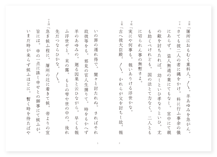 ワキ 官人 シテ 母 ツレ 世守(弟) ツレ 正儀(兄) 地は 唐土 季は 雑 次第「屠所におもむく重科人。〳〵。羊あゆみを急がん。 ワキ「さても彼二人の者に縄をかけ。科に行ふ事余の儀にあらず。盗人無道の業にてもなし。宮中にて親の敵を討ちたれば。幼しといひ孝なりといひ。尤も助くべけれども。国の法とて力なく。二人ともに切られん事の無慙さよ。 下歌「実にや何事も。報いありける浮世かな。 上歌「古へ彼大臣殿。〳〵。かれらが父を討ちし故。報いの罪の遁れ得で。闇々と討たれぬ。さればそれ故彼等をも。邪見の官人生捕りて。時をもかへず羊のあゆみの。廻る因果と云ひながら。早くも報ふ浮世ぞと。末の露。もとの雫や世の中の。後れ先だつならひかな。〳〵。 ワキ詞「急ぎ候ふ程に。屠所の辻に着きて候。帝よりの宣旨には。申の一点に誅し申せとの御事にて候ふが。いまだ時が来らず候ふほどに。暫く時を待たばやと存じ候。 シテ一声「如何にあれなる道行人。そなたへ稚き囚人や二人帰りて候ふか。何帰るとや。それ〳〵留めて給はり候へ。なふそれこそわらはが子にて候へ。旧里を出でし鶴の子の。 地「松にかへらぬ淋しさよ。 地「去る程に。時の未もはや過ぎぬ。申一点も近づけば。二人を西に引きすゑて。既に切らんと進みけり。 シテ「聞くより心うち乱れ。飛び立つばかり思へども。さすが女の身にあれば。先へはさらに行かれず。 地「十念高く唱へつゝ。あたりの人をのけゝれば。 シテ「見物の人々も。おのきあれと急ぎけり。 地「南無阿弥陀仏と唱へつゝ。太刀振り上げて切らんとす。 シテ「剣の下よりも。 地「立ちよりてや。子供に取りつきて泣き居たりや。 ワキ詞「いかに是なる女。何とて大事の首の座敷へは直りけるぞ。 シテ詞「さて彼等をば何しに誅し給ふぞ。 ワキ「今夜内裏に忍び入り。左の大臣殿を討ちたる科により誅するよ。 シテ「なふ其大臣殿は。かれらが為めには親の敵にて候はぬか。 ワキ「中々の事親のかたき候ふよ。 シテ「親のかたきを討ちたる者をば。陣の口をさへ許さるゝと申すたとへの候ふものを。 ワキ「それはさる事なれどもさりながら。この国の大法には。人を討ちたるものをば助けぬ法にて候。 シテ「人を討ちたる者を助けぬ御法ならば。さてかれらが父を討ちし大臣殿をば。何とて今まで助け給ふぞ。 ワキ「それは大人是は小人。いかで其身に対すべき。 シテ「位を重んぜば。賤しきを敵と思ふべからず。彼等は賤しき者なれば。たゞ打ち捨てゝおき給へ。 ワキ「申す処はさる事なれども。もとより定まる法例には。 シテ「一人を討たば。 ワキ「一人を切り。 シテ「二人を討てば。 ワキ「あうそれは二人誅するよ。 シテ「さて彼等は何人討ちたるぞ。 ワキ「大臣殿一人討ちたるなり。 シテ「そは其法こそ違ひたれ。そなたは大臣たゞ一人。此方はかれら兄弟父共には三人。三人の者に別るゝならば。わらはも此世に有るまじや。さもあらば一人のかはりに四人まで失ひ給はん事は如何に。是は憲法の政道か。 ワキ「余りの道理につめられて。此官人も是非を弁へず候。さあらば兄弟の内を一人切り申さうずるにて候。 シテ「あら悲しやみづからを切つて給はり候へ。 ワキ「総じて囚人に身代りはなきぞとよ立ちのき候へ。いかに正儀世守。何れにても本人出でゝ切られ候へ。 世守「さん候本人にて候ふ切つて給はり候へ。 正儀「順義と申し年のほど。唯それがしを切り給へ。 世守「老少不定と聞く時は。親に先だつ子もあれば。弟も兄に先だつべし。 正儀「兄と思はゞ何とてか。我が言ふ事をば背くらん。聞かずは汝不孝たり。 世守「兄弟此世にありてこそ。兄の不孝も恐るべけれ。 地「御身空しくなり給はゞ。不孝とも勘当とも。誰かは我を叱るべき。とても不孝の身とならば。御手に掛けさせおはしませ。 正儀「正儀は言葉を出だし得ず。 シテ「母も涙に咽びけり。 地「邪見の官人も。皆鉾剣を投げ捨てゝ。顔を押へて泣き居たり。 ワキ詞「言語道断何れも剛なる者にて。我さきへ切られん〳〵と申し候ふ程に。時刻が移り候。何れにてもあれ一人えつて出だし候へ。 シテ詞「あら計ひ苦しの母が心のうちや候。兄とやいはん弟とや。正儀は父が形見なり。世守は母が名残なり。 ワキ詞「いや〳〵左様に申せば時刻が移り候。疾う〳〵えつて出だし候へ。 シテ詞「わらはも思ひ定めて候。兄を助けて弟を切つて給はり候へ。 ワキ「あら不思議や。皆人々に弟は乳のあまりとて悲しむ処に。何とて兄を助け弟を切れとは申すぞ。 シテ「是も謂の候ふぞとよ。兄は継子弟はわらはが実子にて候。 ワキ「さればこそゝれにつけても不審なれ。まさしき継子を助け置き。わが子を切れと申す事。返す〴〵も不審なり。 シテ「兄を殺さば本よりも。憎みて切るこそ道理なれと。草の陰なる彼等が父の。思はん事も恥かしければ。さてこそ兄を助け。弟を切つて給はんとは。せんかたなさに申すなり。 ワキ「あら不便や候。さては継母継子