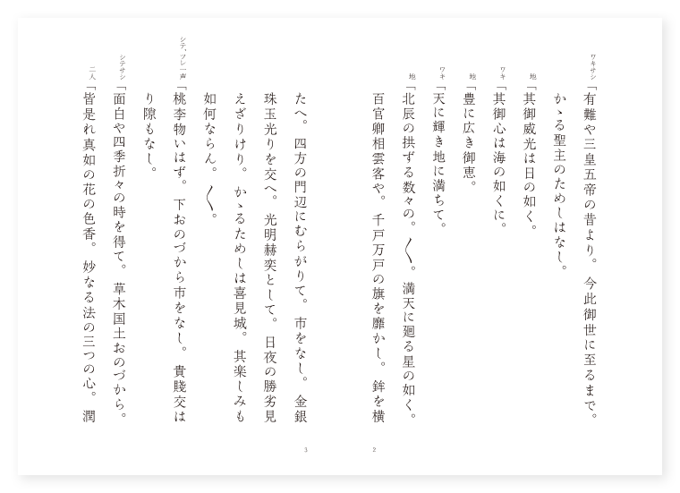 世阿弥作 前 ワキ 帝王 シテ 里女 ツレ 侍女 後 シテ 西王母 ツレ 仙女 地は 唐土 季は 春 ワキサシ「有難や三皇五帝の昔より。今此御世に至るまで。かゝる聖主のためしはなし。 地「其御威光は日の如く。 ワキ「其御心は海の如くに。 地「豊に広き御恵。 ワキ「天に輝き地に満ちて。 地「北辰の拱ずる数々の。〳〵。満天に廻る星の如く。百官卿相雲客や。千戸万戸の旗を靡かし。鉾を横たへ。四方の門辺にむらがりて。市をなし。金銀珠玉光りを交へ。光明赫奕として。日夜の勝劣見えざりけり。かゝるためしは喜見城。其楽しみも如何ならん。〳〵。 シテ、ツレ一声「桃李物いはず。下おのづから市をなし。貴賤交はり隙もなし。 シテサシ「面白や四季折々の時を得て。草木国土おのづから。 二人「皆是れ真如の花の色香。妙なる法の三つの心。潤ふ時や至りけん。三千年に咲く花心の。をり知る春のかざしとかや。 下歌「いざや君に捧げん。いざ〳〵君に捧げん。 上歌「すべらぎの。其御心は普くて。〳〵。隙行く駒の法の道。千里の外まで上もなき。道に至りて明らけき。霊山会場の法の場。広き教の真ある。君々たれば誰とても。勇みある世の心かな。〳〵。 シテ詞「如何に奏聞申すべき事の候。 ワキ詞「奏聞とは如何なる者ぞ。 シテ「是は三千年に花咲き実なる桃花なるが。今此御代に至り花咲く事。たゞ此君の御威徳なれば。仰ぎて捧げ参らせ候。 ワキ「そも三千年に花咲くとは。如何さま是は聞き及びし。其西王母が園の桃か。 シテ「中々にそれとも今は物いはじ。 ワキ「さればこそゝれぞ殊更名におふ花の。 シテ「桃李物いはず。 ワキ「春いくばくの年月を。 シテ「送り迎へて。 ワキ「此春は。 地「三千年に。なるてふ桃の今年より。〳〵。花咲く春に逢ふ事も。唯是れ君の四方の恵。あつき国土の千々の種。桃花の色ぞ妙なる。 ロンギ地「さては不思議や久堅の。天つ乙女の目のあたり。姿を見るぞ不思議なる。 シテ「疑ひの。心な置きそ露の間に。宿るか袖の月の影。雲の上まで其恵。普き色にうつりきぬ。 地「うつろふ物は世の中の。人の心の花ならぬ。 シテ「身は天上の。 地「楽しみに。明けぬ暮れぬと送り迎ふ。年は経れど限りもなき。身の程も隔なく。誠は我こそ西王母の。分身よまづ帰りて。花の身をも顕はさんと。天にぞ上りける。天にぞ上り給ひける。(中入) ワキ歌「糸竹呂律の声々に。〳〵。しらべをなして音楽の。声すみ渡る天つ風。雲の通路心せよ。〳〵。 地「面白や。かゝる天仙理王の。来臨なれば数々の。孔雀鳳凰迦陵頻伽。飛び廻り声々に。立ち舞ふや袖の羽風。天つ空の衣ならん。天の衣なるらん。 シテ「いろ〳〵の捧物。 地「いろ〳〵の捧物の。中に妙に見えたるは。西王母の其姿。ひかり庭宇をかゝやかし。黄錦の御衣を着し。 シテ「剣を腰に提げ。 地「剣を腰に提げ。真纓の冠を着。玉觴に盛れる桃を。侍女が手より取りかはし。 シテ「君に捧ぐる桃実の。 地「花の盃取りあへず。(中の舞) 地「花も酔へるや盃の。〳〵。手まづさへぎる曲水の宴かや。御溝の水に。戯ぶれ戯ぶるゝ手弱女の。袖も裳裾もたなびきたなびく。雲の花鳥春風に和しつゝ。雲路に移れば。王母も伴なひ攀ぢ上る。王母も伴なひ上るや天路の。ゆくへも知らずぞなりにける。 底本:国立国会図書館デジタルコレクション『謡曲評釈 第九輯』大和田建樹 著