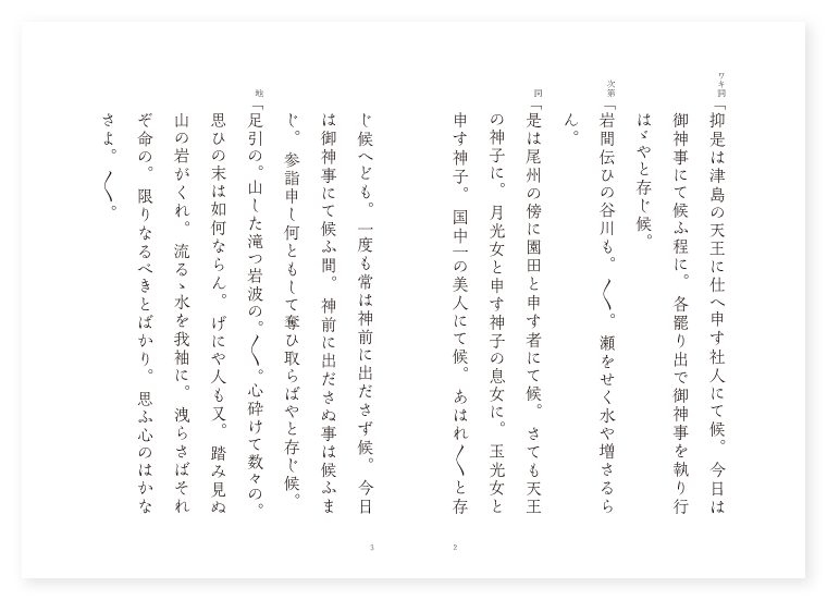 ワキ 社人 ツレ 園田 ツレ 神子 トモ 社人の従者 ワキヅレ 寄手 シテ 神体 地は 尾張 季は 雑 ワキ詞「抑是は津島の天王に仕へ申す社人にて候。今日は御神事にて候ふ程に。各罷り出で御神事を執り行はゞやと存じ候。 次第「岩間伝ひの谷川も。〳〵。瀬をせく水や増さるらん。 詞「是は尾州の傍に園田と申す者にて候。さても天王の神子に。月光女と申す神子の息女に。玉光女と申す神子。国中一の美人にて候。あはれ〳〵と存じ候へども。一度も常は神前に出ださず候。今日は御神事にて候ふ間。神前に出ださぬ事は候ふまじ。参詣申し何ともして奪ひ取らばやと存じ候。 地「足引の。山した滝つ岩波の。〳〵。心砕けて数々の。思ひの末は如何ならん。げにや人も又。踏み見ぬ山の岩がくれ。流るゝ水を我袖に。洩らさばそれぞ命の。限りなるべきとばかり。思ふ心のはかなさよ。〳〵。 ワキ「神垣は神の御室の榊なれば。神の御前に繁りあふ。貴賤群集ぞ有難き。 園田「我は又。さらぬやうにて立ち寄り見れば。げにも玉光女なり。心も空にかはり。それ〳〵宮人御神楽を。急ぎ給へと勧むれば。 地「其色々の役々の。拍子を揃へ歌ふなり。 ミコ「榊葉の。香をかぐはしみとめくれば。八十氏人ぞ円居せりける。(神楽) ワカ「みてぐらは。我にはあらず天にます。豊岡姫の宮のみてぐら。豊岡姫のみてぐらなり。 地「さるほどに。〳〵。折節よしと。一同に走り寄り。とう〳〵神子を貴賤の中に。飛鳥の如く飛び翔つて。行方も知らずぞなりたりける。 ワキ「何と申すぞ。玉光女を奪ひ取りて行くと申すか。やるまじいぞ。 トモ「暫く候。今日は御神事なり。明日はさし寄せ腹切らせん。 ワキ「げに〳〵是も理りなり。神慮もさぞな神楽歌に。祝ひこし神は祭りつ明日よりは。組の緒をしめ遊び太刀はき。今日は還御急ぎつゝ。 地「明日はさし寄せ園田を。〳〵。討ち取り本望を達せんと。詮議をなして帰りけり。〳〵。 ヨセテ「明くる空。遅しと告ぐる庭鳥の。八声の閧をつくりけり。 ワキ詞「如何に園田たしかに聞け。天王よりの御使に。御榊持たせて参りたり。出でよや出でよと罵りけり。 園田「園田是にあり。何のための御使にて候ふぞ。 ワキ「何のためとは玉光姫。あまりに暗々と奪はれたる。無念散ぜん為めぞとよ。 園田「神慮に更に対し申さず去りながら。面々をたゞにてはいかで帰すべき。此の矢一筋うけて見よと。 地「十三束を打ちつがひ。〳〵。よつ引き放つ其矢の。不思議や行方も白真弓。あら面目なや候。さては早運槻弓。〳〵ぞと心得て。弓切り折つて遥に投げ捨て。大太刀おつ取り。追手より切つて出づれば。勇み勇む。社家の若武者。打つ太刀を受け流し。飛べば横太刀出ださせず。さつとむすび上げ。一太刀に勝負を見せにけり。 ワキ「然れども宮人。 地「然れども宮人。身命を軽んじ。長刀とりのべ。園田を目がけてかゝりければ。当の矢一筋かへさし〳〵。待てよや待てと雲の上に。大音声こそ聞えけれ。 シテ「神体大牛に乗じ給ひ。 地「神体大牛に乗じ給ひ。汝まさに。射る矢は社頭の扉を貫く。当の矢一筋。神通方便の御弓に打ち番ひ。放ち給へは。雷電まさに落ちかゝる如く。天に仰ぎ地に倒れ。逆さまに櫓より。遠近の土となる。 ワキ「此時宮人。 地「此時宮人。あふぎて神恩の高きを感じ。臥して結縁の深き川波に。うづまひめぐる。〳〵。水の煙に立ちまぎれて。神は上らせ給ひけり。 底本:国立国会図書館デジタルコレクション『謡曲評釈 第四輯』大和田建樹 著