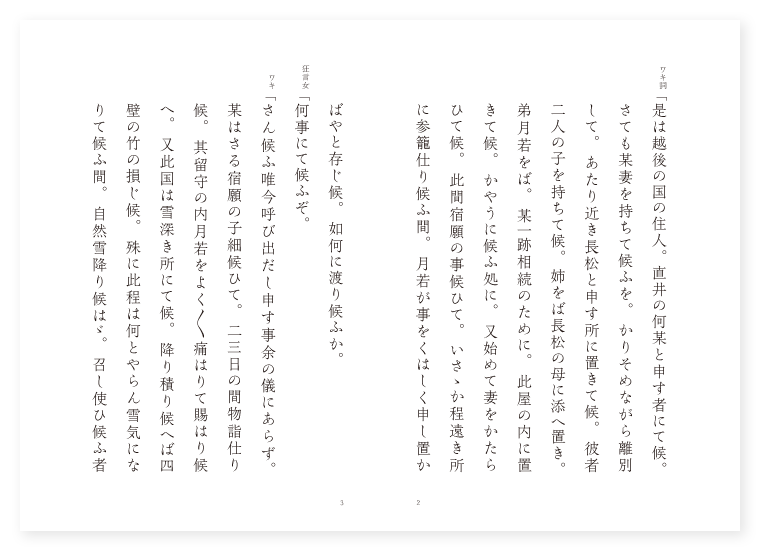 ワキ 直井何がし 狂言 直井後妻 子方 直井の子月若 狂言 直井従者 シテ 直井前妻 ヒメ 月若姉 地は 越後 季は 冬 ワキ詞「是は越後の国の住人。直井の何某と申す者にて候。さても某妻を持ちて候ふを。かりそめながら離別して。あたり近き長松と申す所に置きて候。彼者二人の子を持ちて候。姉をば長松の母に添へ置き。弟月若をば。某一跡相続のために。此屋の内に置きて候。かやうに候ふ処に。又始めて妻をかたらひて候。此間宿願の事候ひて。いさゝか程遠き所に参籠仕り候ふ間。月若が事をくはしく申し置かばやと存じ候。如何に渡り候ふか。 狂言女「何事にて候ふぞ。 ワキ「さん候ふ唯今呼び出だし申す事余の儀にあらず。某はさる宿願の子細候ひて。二三日の間物詣仕り候。其留守の内月若をよく〳〵痛はりて賜はり候へ。又此国は雪深き所にて候。降り積り候へば四壁の竹の損じ候。殊に此程は何とやらん雪気になりて候ふ間。自然雪降り候はゞ。召し使ひ候ふ者どもに仰せ付けられ候ひて。あたりの竹の雪を払はせられ候へ。 狂言女「何と御物詣と候ふや。めでたうやがて御下向候へ。又竹の雪の事は心得申し候。又月若殿の事よく〳〵痛はれと仰せられ候。あら今めかしや候。何方への御留守にてもよく痛はらぬ事の候ふか。 ワキ「いや幼き者の事にて候ふ程にかやうに申し候。さらばやがて下向申さうずるにて候。 狂言女「如何に月若。父御は物詣とて御出で候。御留守の間に月若をよく〳〵痛はれと仰せ置かれて候。是は今めかしき事を仰せ候。いかさまおことは殿へ妾が悪くあたるなどゝ告口をして有るな。あらにくや〳〵腹立や。 子「実に世の中に月若程。果報なき者よもあらじ。あけくれ思ひを信濃なる秩父の山。秋はてぬれば柞の森の。頼む方なくなり果てぬ。たゞ長松におはします。母と姉御に暇を乞ひ。何方へも行かばやと思ひ候。 シテサシ「此程は松吹く風も淋しくて。伴なふ物は月の影。人も訪ひこぬ隠れがの。柴の扃のあけくれは。いつまで誰を長松の。緑子故の住居かな。 子詞「如何に申し候。月若が参りて候。 シテ詞「何月若と申すか。あらうれしと来りたるや。人数多連れて来りたるか。 子「いやひとり参りて候。 シテ「あら心もとなや。早日の暮れて有るに。何とてひとりは来りたるぞ。 子「さん候唯今参る事は継母御の。 シテ「あゝ暫く。名のらずはいかゞそれとも夕暮の。面影変はる月若かな。あはれや実に我添ひたりし時は。さこそもてなしかしづきしに。梓弓やがていつしか引きかへて。身に着る衣は只鶉の。所々もつゞかねば。何とも更にゆふしでの。肩にもかゝるべくもなし。花こそ綻びたるをば愛すれ。芭蕉葉こそ破れたるは風情あれ。 下歌地「いづくに風のたまりつゝ。寒さを防ぎけるらん。 上歌「短夜の。夢かや見れば驚くは。〳〵。山田の鹿の如くなる。伏処荒れ立つ草むらに。尋ねて来たる志。親子ならではかく有らじ。〳〵。 狂言女「あら不思議や。月若が見え候はぬぞや。如何に誰かある。 狂言男「御前に候。 狂言女「月若は何処へ行きてあるぞ。 狂言男「更に存ぜず候。 狂言女「いや〳〵推量して候。先にちと言ひごとをしてあれば心にかけて。例の長松の母の方へ告口しに行きて有るな。あら憎や。只今父御の御帰り有つて召すと申して連れて来り候へ。 狂言男「畏つて候。如何に申し候。殿の御帰り有つて月若殿と召され候。急いで御帰り候へ。 シテ「何父御の召され候ふとや。あら悲しやたま〳〵来りたる物を。さりながら召しにて候はゞとく参りて。又此程に来りて母を慰め候へ。 狂言男「如何に申し候。月若殿を御供申して参りて候。 狂言女「如何に月若。さればこそ又長松に行きて告口して有るな。父の仰せ置かれて候。雪降らば四壁の竹の雪を払はせよと仰せ候ふが。事の外雪降りて候ふ程に。急いで竹の雪を払ひ候へ。物を脱ぎ小袖一つにて払ひ候へ。 子「さりとては払はでかくて有るならば。 地「払はでかくて有るならば。我のみならず。母上も姉御前も。思ひは長松の風。身にしむばかり更くる夜の。雪さむうして払ひかね。帰らんとすれば門をさす。明けよとたゝけど音もせず。あら寒や堪へがたや。月若たすけよ。実にや無常のあらき風。憂き身ばかりつらきかなと。思ふかひなき月若は。終に空しくなりにけり。〳〵。 狂言男「何と申すぞ。月若殿雪に埋もれて空しくなり給ひたると申すか。あら痛はしの御事や候。さこそ長松に御座候ふ母御の御歎き候はんずらん。やがて此由を長松に申し候ふべし。いかに申し候。月若殿竹の雪に埋もれて空しく御なり候。 シテ、ヒメ「実に〳〵生を受くるたぐひ。誰か別れを悲しまざる。されば大聖釈尊も。羅睺為長子と説き。又西方極楽の教主法蔵比丘は。御子の太子を悲しみ。鹿野苑に迷はせ給ふとこそ承りて候へ。況んや人間に於てをや。誰かは子を思はざる。 二人次第「ふるに思ひの積る雪。〳〵。消えし我子を尋ねん。 二人一声「子を思ふ。身を白雪の振舞