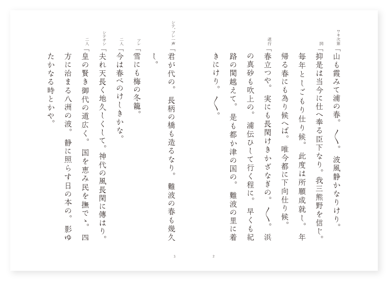 世阿弥作 前 ワキ 官人 シテ 老翁 ツレ 男 後 ツレ(天女) 木花開耶姫 シテ 王仁 地は 摂津 季は 正月 ワキ次第「山も霞みて浦の春。〳〵。波風静かなりけり。 詞「抑是は当今に仕へ奉る臣下なり。我三熊野を信じ。毎年としごもり仕り候。此度は所願成就し。年帰る春にも為り候へば。唯今都に下向仕り候。 道行「春立つや。実にも長閑けきかざなぎの。〳〵。浜の真砂も吹上の。浦伝ひして行く程に。早くも紀路の関越えて。是も都か津の国の。難波の里に着きにけり。〳〵。 シテ、ツレ一声「君が代の。長柄の橋も造るなり。難波の春も幾久し。 ツレ「雪にも梅の冬籠。 二人「今は春べのけしきかな。 シテサシ「夫れ天長く地久しくして。神代の風長閑に傳はり。 二人「皇の賢き御代の道広く。国を恵み民を撫でゝ。四方に治まる八洲の波。静に照らす日の本の。影ゆたかなる時とかや。 下歌「春日野に。若菜摘みつゝ万代を。 上歌「祝ふなる。心ぞしるき曇りなき。〳〵。天つ日嗣の御調物。運ぶ巷や都路の。直なる御代を仰がんと。関の戸さゝで千里まで。普く照らす日影かな。〳〵。 ワキ詞「如何に是なる老人に尋ぬべき事の候。 シテ詞「此方の事にて候ふか何事にて候ふぞ。 ワキ「不思議やな諸木こそ多き中に。是なる梅の木蔭を立ち去らずして。陰を清め賞翫し給ふ事不審なり。若し此梅は名木にて候ふか。 シテ「御姿を見奉れば。都の人にて御坐候ふが。此難波の浦に於て。色異なる梅花を御覧じて。名木かとの御尋ねは御心なきやうにこそ候へ。 ツレ「夫れ大方の春の花。木々の盛は多けれども。花の中にも始めなれば。梅花を花の兄ともいへり。 シテ「其上梅の名所々々。国々所は多けれども。六義の始めのそへ歌にも。難波の梅こそよまれたれ。 ツレ「御代も開けし栄花といひ。 シテ「普き花の嘉例と云ひ。 二人「とにもかくにも津の国の。此や都路の難波津に。名を得て咲くやこの花を。名木かとの御尋ねは。事あたらしき御諚かな。 ワキ「実に〳〵難波の梅の事。名木やらんと尋ねしは。愚かなりける問事かな。然れば歌にも難波津に。咲くやこの花冬ごもり。今は春べと咲くやこの。花の春冬かけてよめる。歌の心は如何なるぞ。 シテ「それこそ帝をそへ歌の。心詞は顕はれたれ。難波の御子は皇子ながら。未だ位に即き給はねば。冬咲く梅の花の如し。 ワキ「御即位ありて難波の君の。位に備はり給ひし時は。 シテ「今こそ時の花の如く。 ワキ「天下の春を知ろしめせば。 シテ「今は春べと咲くやこの。 ワキ「花の盛は大鷦鷯の。 シテ「帝を花にそへ歌の。 ワキ「風も治まり。 シテ「立つ波も。 地「難波津に。咲くやこの花冬ごもり。〳〵。今は春べに匂ひ来て。吹けども梅の風。枝を鳴らさぬ御代とかや。実にや津の国の。何はの事に至るまで。豊かなる世の例こそ。実に道広き治めなれ。〳〵。 地クリ「抑難波津の歌は帝の御始め。又浅香山の詞は。釆女の土器とり〴〵なり。 シテサシ「昔唐国の尭舜の御代にも越えつべし。 地「万機の政おだやかにして。慈悲の波四海に普く。治めざるに平かなり。 シテ「君々たれば臣も又。 地「水よく船を浮ぶとかや。 クセ「高き屋に。登りて見れば煙立つ。民のかまどは賑ひにけりと。叡慮にかけまくも。かたじけなくぞ聞えける。然れば此君の。代々にためしを引く事も。実に有難き詔。国々に普く。三年の御調ゆるされし。其年月も極まれば。浜の真砂の数積りて。雪は豊年の御調物。ゆるす故にや中々。いやましに運ぶ御宝の。千秋万歳の。千箱の玉を奉る。 シテ「然れば普き御心の。 地「いつくしみ深うして。八洲の外まで波もなく。広き御恵。筑波山の陰よりも。茂き御陰は大君の。国なれば土も木も。栄えさかふる津の国の。難波の梅の名にしおふ。匂ひも四方に普く。一花ひらくれば天下皆。春なれや万代の。なほ安全ぞめでたき。 ロンギ地「実に万代の春の花。〳〵。栄え久しき難波津の。昔語りぞおもしろき。 シテ「実に名にしおふ難波津に。鳥の一声をりしもに。鳴く鶯の春の曲。春鶯囀を奏せん。 地「不思議や御身誰なれば。かく心ある花の曲。舞楽を奏し給ふべき。 ツレ「我は知らずや此梅の。春年々の花の精。 地「今一人の老人は。 シテ「今ぞ顕はす難波津に。 地「咲くやこの花と詠じつゝ。位をすゝめ申せし。百済国の王仁なれや。今もこの花に戯ぶれ。百囀の声立て。春の鶯の舞の曲。夜もすがら慰め申すべしや。下臥して待ち給へ。花の下ぶしに待ち給へ。(中入) ワキ歌「見て暮らす。花の下臥更くる夜の。〳〵。月影ともに静かなる。けしきに染みて音楽の。花に聞ゆる不思議さよ。花に聞ゆる不思議さよ。 後ジテ「誰かいひし春の色は。東より来るといへども。南枝花初めて開く。こゝは所も西の海に。向ふ難波の春の夜の。月雪もすむ浦の波。夜の舞楽はおもしろや。夢ばし覚まし給ふなよ。 天女「是は難波の浦に年を経て。ひらくる代々の恵みを受くる。木花開耶姫の神霊なり。 シテ「我は