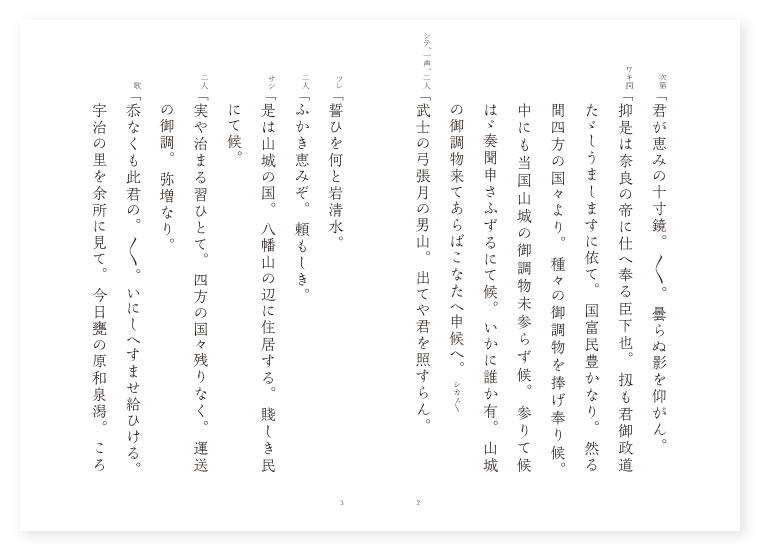 前シテ 武内の神の化身 前ツレ 玉垂の命の化身 後シテ 高良の神(武内玉垂二神合一) ワキ 奈良の臣下 ツレ 同 所 前 大和奈良 後 山城男山 次第「君が恵みの十寸鏡。〳〵。曇らぬ影を仰がん。 ワキ詞「抑是は奈良の帝に仕へ奉る臣下也。扨も君御政道たゞしうましますに依て。国富民豊かなり。然る間四方の国々より。種々の御調物を捧げ奉り候。中にも当国山城の御調物未参らず候。参りて候はゞ奏聞申さふずるにて候。いかに誰か有。山城の御調物来てあらばこなたへ申候へ。シカ〴〵 シテ、一声、二人「武士の弓張月の男山。出てや君を照すらん。 ツレ「誓ひを何と岩清水。 二人「ふかき恵みぞ。頼もしき。 サシ「是は山城の国。八幡山の辺に住居する。賤しき民にて候。 二人「実や治まる習ひとて。四方の国々残りなく。運送の御調。弥増なり。 歌「忝なくも此君の。〳〵。いにしへすませ給ひける。宇治の里を余所に見て。今日甕の原和泉潟。ころも鹿脊山うちすぎて。漸々行けば程もなく。都に早く着にけり。〳〵。 ワキ詞「不思議やな。余の国々よりは色々の。御調を備ふる中に。山城の国に限つて弓箭を捧る事は。いかさま謂の有やらん。委く申候へ。 シテ「夫弓と申は。天地陰陽を表し。四徳五行の形を顕す。 ツレ、カヽル「されば神には桑の弓。蓬の矢にて国を治め。怨敵を払ひ世を静め。 シテ「悪魔を退く宝とかや。 同「我もいやしき身なれども。〳〵。かゝる事をば白真弓。君にひかれて民までも。豊かに住る有難や。〳〵。 クリ地「抑弓箭を以て世を治めし始めといつぱ。先我朝におゐては。応神天皇にておはします。 サシ「しかれば神功皇后。詔して宣まはく。縦ひ女人の身なりとも。先帝の御為なれば。異国へむかはでかなふまじと。始めて御鎧を召し弓箭を帯し。みづから異狄を。平げ給ふ。 クセ「其後宇佐の宮に移りまし皇子。御誕生成給ふ。則応神天皇は。八幡宮の御事なり。威重三尊の形を。行教の袖にうつして。此幡の本にこめ給ふ。八重旗雲を指南にて。宗廟の神と顕はれ。弓矢の家を守らん。されば今の御代。仰ぐに付て愚かならず。君にひかるゝ玉水。上清ば下も濁らず。いよ〳〵すなほなりけり。 シテ「君は船臣は水。水よくふねをうかべては。臣よく君を仰ぐ世の。幾久しさも白真弓。八百万代を治めつゝ。又は仏法王法の。治まる国となる事は。一張の弓のいきほひたり。東南西北の敵をやすくたいらぐる。 ロンギ地「不思議なりとよかた〴〵は。〳〵。凡夫ならず覚えたり。其名を名乗おはしませ。 シテ「我名を何と石清水。深き誓ひを守らんと。是まで現じ来れりと。 地「二人の者はたちまちに。ふたつの鳩とあらはれて。八幡をさして飛で行。〳〵。(中入) ワキ、カヽル「忝なくも大内は。此八幡山にぞ御幸なる。 地「巫八乙女もろともに。 歌、同「花を手折て身をかざり。〳〵。猶も奇特を見るやとて。信心を起し祈念する。〳〵。 後シテ、一声「我は是本地玉垂命武内の神成が。弓箭の家を守らん為。今又顕はれ出たるなり。 地「万代迄も栄へゆく。松をかざしの袂かな。(舞) 同「そも〳〵四方をふうずる。〳〵。三尺の剣の光には。 シテ「怨敵の四魔を降伏し。非法を治む政事。 地「扨又天津空社に。差上げ給ふ舞の手は。天長かれと祈りて。かなづるまでの手成ゆへ。 シテ「手を折足を揚るは。 地「是大日の陽分。 シテ「しゆめつ法界とかなづる舞の手なるゆへ。太平楽と名付たり。 同「又はぶつしやうの。軍に向ふ度毎に。陣を破れる舞なれば。破陣楽とも名付たり。実ありがたき君が代の。ばんぜいらくぞめで度。〳〵。 底本:国立国会図書館デジタルコレクション『古今謡曲解題』丸岡桂 著、『宴曲十七帖 謡曲末百番』国書刊行会 編