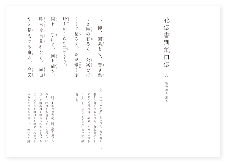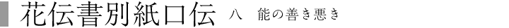 花伝書七篇は、芸能の花を伝へんが為に書かれたものである。しかも、その最後に到つて、「花などといふものは別にあるものではない」と断じ去つて、それで涼しい顔をして居るのは、誠に人を喰つた態度の如くに一見思はれる。しかし、花が無いといふ事は、他面より見れば、すべてが花であるといふに等しい。ただ花を花たらしめるものは「奥儀を究めてよろづに珍らしき理を我と知る」ことである。「善悪不二・邪正一如」といふ経典の文句を引用したのは、本来より見れば善なるもの悪なるものは無いといふ事を述べんが為である。時に当つて用に足れば善となり、用に足らねば悪となる。それと同じく、芸能の花といふも、その芸能がその時と場合によつて、見物に珍らしく面白く感じられれば花となり、珍らしく面白い感をあたへ得なければ花とはならない。「珍らしく面白く感じる」といふ事は、言葉をかへていへば、その時に用足ることである。時と場所と人とによつて、其の見物の好尚も区々である。従つて、一つの風体を花なりとして定めては、所謂琴柱に膠するたぐひであつて、変化に応ずる妙味は欠けてしまふ。それでは花が花でなくなる。従つて、すべては花であつて、すべては又花ではない。ここが善悪不二邪正一如といふ境である。