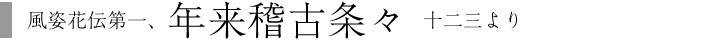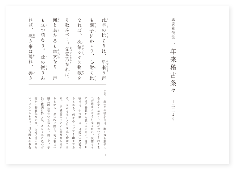 〔評〕 此の章の内容は四段に分ち得る。先づ童形で美声であるから、花めく時代であるといふ事。第二に、あまり細かい物真似をさせるべきでないといふこと。但し出来るならば、無理に抑制せずして、自然の発露にまかせて良い。第三に、如何に此の時代に巧妙であり立派でも、それは未だ一時の花であり、従つて、将来を卜定するには足りぬものであること。第四に、此の時代の稽古の要領は、容易な芸で花を咲かせ、一面に、謡・舞・働きに於ては、確実に楷書的に、念入りに稽古すべき事を説いて居るのである。