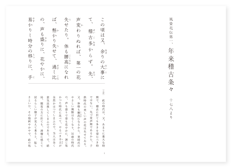 〔口訳〕 此の時代は、又、あまりに重大な時期で、稽古に於ても多きを望むべき時ではない。先づ変声期であるから、子供時代の美しい声の花は失せてゐる。又、体格も腰高になるから、児時代のやさしい風情はなくなり、以前の時代の、声も盛りで姿も花やかに、演じ易かつた時代に比べて、やるべき手立が全然かはつてしまふので、当人は全く意気沮喪してしまふのである。で、結局、観客の方に於ても、滑稽に感じて居るらしい様子が見えて来ると、恥しさといひ、その他何やかやで、此の処で大ていへ、こ、た、れ、てしまふものだ。此の時代の稽古としては、たとひ人から指ざしして笑はれても、そんな事に頓着せず、内に於ては、自分の声の出し得る限度の調子で、宵・暁の稽古をはげみ、心中には大願をおこして、自分一生涯の成功不成功の堺は今にあるのだと覚悟して、今後一生涯の事を考へ、どこまでも能を捨てずにか、じ、り、つ、く、より以外に稽古のやり方はないのである。此の際に捨ててしまつては、能はそのまま上達を止めてしまふ。一体に、如何なる調子でやるかは、その人個々の声によつてきまるものだが、大体から見て、黄鐘・鸞鏡あたりまでの調子を用ひるがよい。調子といふことにあまり拘はつて、出ない声を無理に出したりなどすると、身なりに悪い癖が出るものであるし、又、さやうな無理をすると、声も後年になつてからいけなくなるものである。