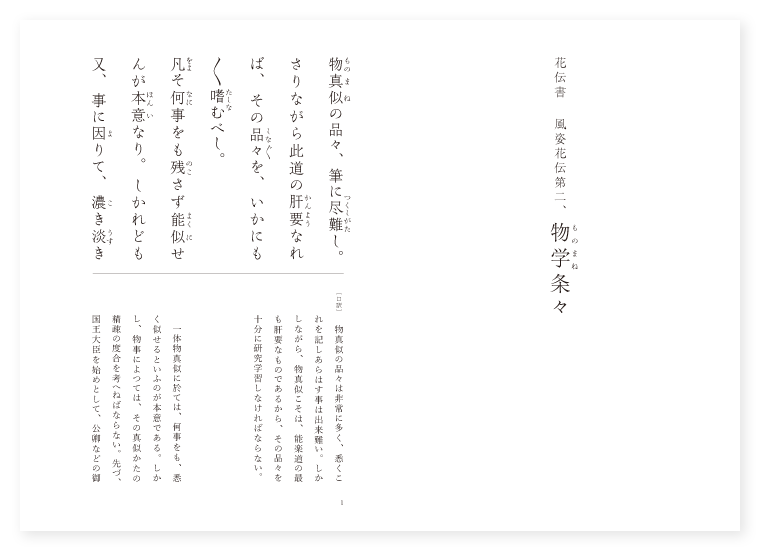 〔評〕 此段は、物真似の真似方についての総論をのべて居る。物真似としては、「何事をも残さずよく似せる」といふのが、その本旨である。又、かやうにすべての尊卑雅俗を悉く似せることによつて、猿楽は老若男女都鄙貴賤に歓迎せられて発展して来たものであつたと思はれる。