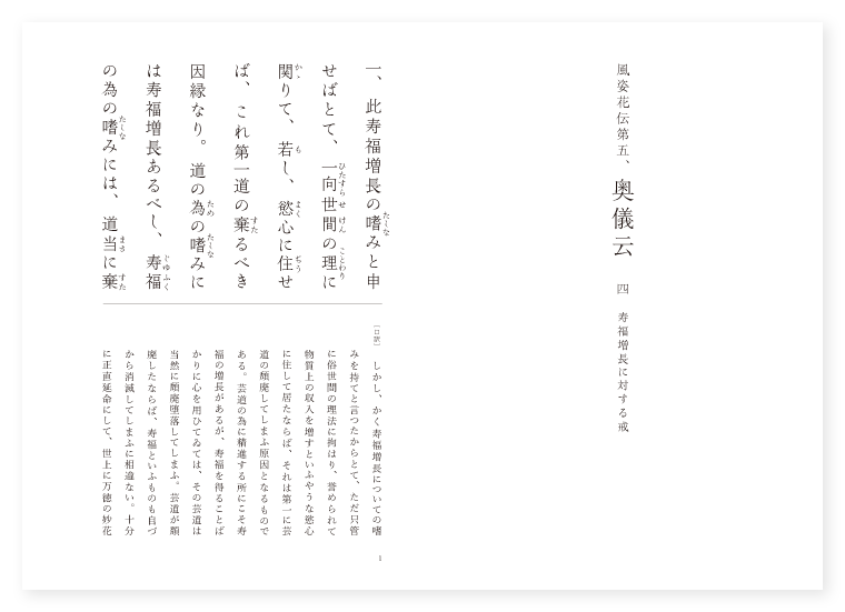 〔口訳〕 しかし、かく寿福増長についての嗜みを持てと言つたからとて、ただ只管に俗世間の理法に拘はり、誉められて物質上の収入を増すといふやうな慾心に住して居たならば、それは第一に芸道の頽廃してしまふ原因となるものである。芸道の為に精進する所にこそ寿福の増長があるが、寿福を得ることばかりに心を用ひてゐては、その芸道は当然に頽廃堕落してしまふ。芸道が頽廃したならば、寿福といふものも自づから消滅してしまふに相違ない。十分に正直延命にして、世上に万徳の妙花を開く因縁であると信じて、道を嗜むべきである。 凡そ、風姿花伝の中、年来稽古条々より始めて、此の奥儀までの条々に於て記したところは、全く自分の力で考へ出した工夫才覚ではない。幼少以来、亡父の御蔭によつて一人前になり得てから二十余年の間、或は眼にふれ、或は耳に聞き置いたまゝ、亡父の風を受けて、道の為家の為にこの書を作るのであつて、私意のものでは全然ない。