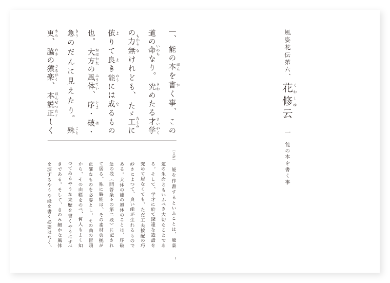 〔口訳〕 能を作書するといふことは、能楽道の生命ともいふべき大切なことである。そして、学才に於て深遠な造詣を究めて居なくても、ただ工夫按配の巧妙さによつて、良い能が生れるものである。大体の能の風体のことは、