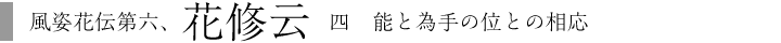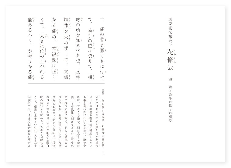 〔口訳〕 能を演ずる際に、如何なる曲が善いか又は悪いかといふ事を定める場合に、その演者の芸の位に相応するといふ事を考へなければならない。能の中には、大やうな能で、別に文字文章の美しさや風体の幽玄などといふ事を求めて作つた曲でなく、正しい典拠によつて作られ、非常に曲の位の上つた能があるものだ。かやうな能は、見物の目にうつる処は、さほど細かな面白味の無いことがある。かやうな能になると、相当に上手といはれてゐる為手が演じても、うまく似合はない事がある。又、たとひこの位の上つた曲に相応する程の無上の上手が演じても、鑑識眼の高い見物の前や、晴れの檜舞台といふべきやうな大所で演ずるのでなくては、その能がうまく成功を収めるといふことはあり得ない。即ち、能といふものは、その曲の位・演者の芸位・観賞者・その演能の場所・演能の時分、これ等が悉く相応し合致しなくては、容易に成功するものではないのである。
