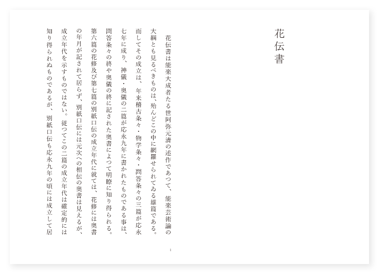 風姿花伝、年来稽古より別紙に至るまでは、此道を顕ス花智秘伝也。是は亡父芸能色々を、廿余年間、悉為二書習得一条々也。此花鏡一巻、世阿私に四十有余より老後ニ至まで、時々浮ム所ノ芸得、題目六ケ条、事書十二ケ条、連続為レ書、芸跡トシテ残所也。